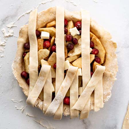 Place sliced apples into the bottom crust, forming a slight mound. Lay four pastry strips vertically and evenly spaced over apples, using longer strips in the center and shorter strips at the edges.